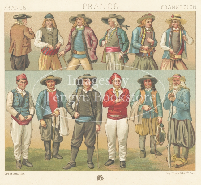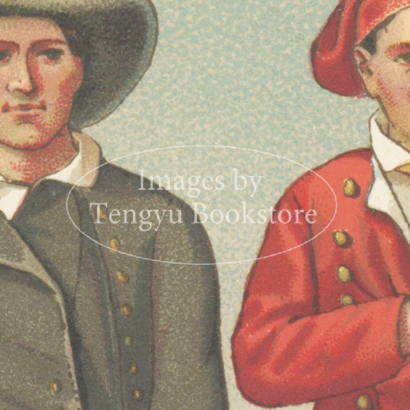 多色刷石版によってカラー印刷された、世界の歴史的衣装や民族衣装の図は、資料的な価値はもちろん、美術的にも評価の高い貴重なイラストです。