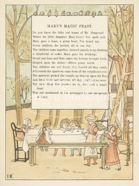 同時代の絵本画家ケイト・グリーナウェイからの強い影響がうかがえる多色刷木版絵本です。