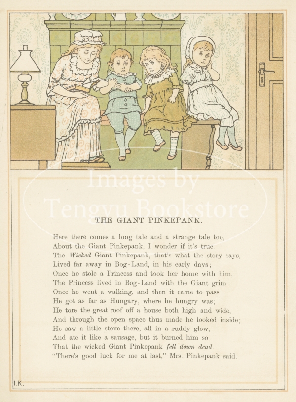 同時代の絵本画家ケイト・グリーナウェイからの強い影響がうかがえる多色刷木版絵本です。