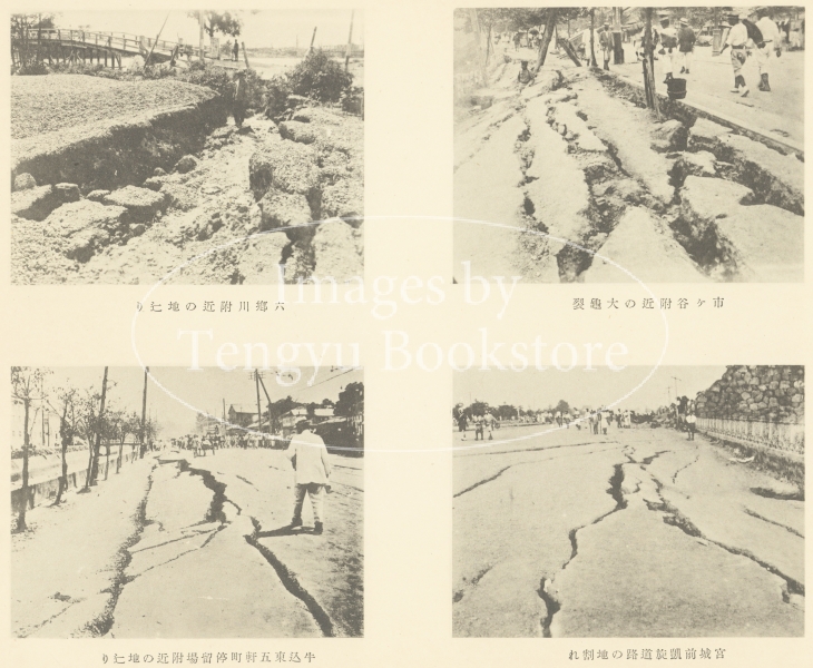 「市ヶ谷附近の大亀裂/宮城前凱旋道路の地割/六郷川附近の地辷り/牛込区東五軒町停留場附近の地辷り」