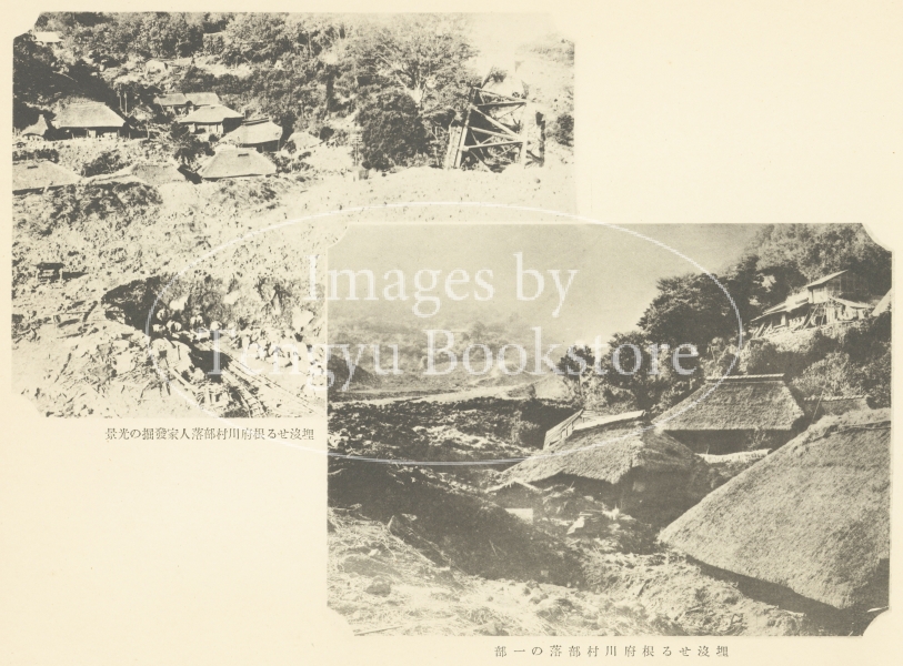 「埋没せる根府川村部落の一部/埋没せる根府川村部落人家発掘の光景」