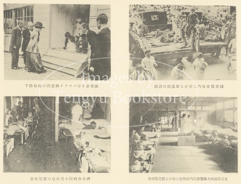 「浅草寺境内に於ける救護団の活動/東京市臨時大塚施療院内科病室に於ける震災傷病者/麻布赤十字バラック御慰問の国母陛下/恩賜財団済生会病院小児科室の嬰児収容」