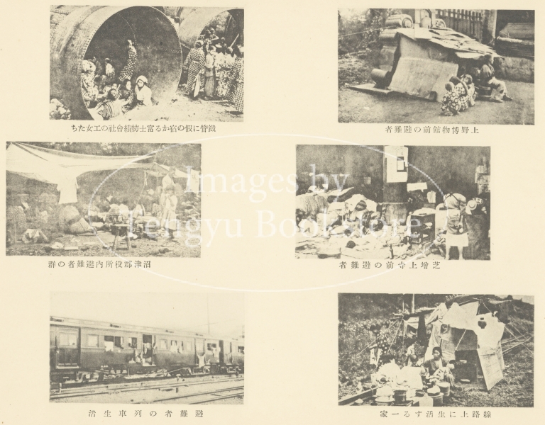 「上野公園博物館前の避難者/芝増上寺内の避難者/線路上に生活する一家/鉄管に仮の宿かる富士紡績株式会社の工女たち/沼津郡役所内避難舎の群/避難者の列車生活」