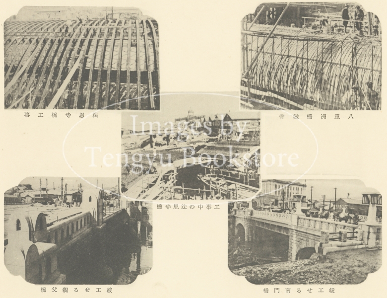 「八重洲橋鉄骨(交通施設復興其十二)/法恩寺橋鉄骨(交通施設復興其十三)/工事中の法恩寺橋(交通施設復興其十四)/竣工せる南門橋(交通施設復興其十五)/竣功せる親父橋(交通施設復興其十六)」