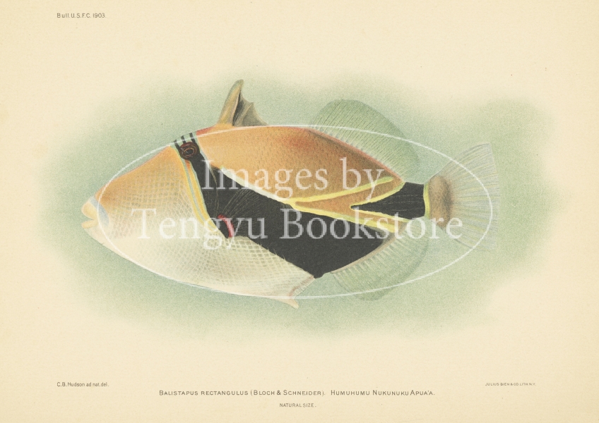 本図は、ハワイ州の州魚であり、ハワイ語でフムフムヌクヌクアプアアと呼ばれている、タスキモンガラ(Rhinecanthus rectangulus)の図版です。
