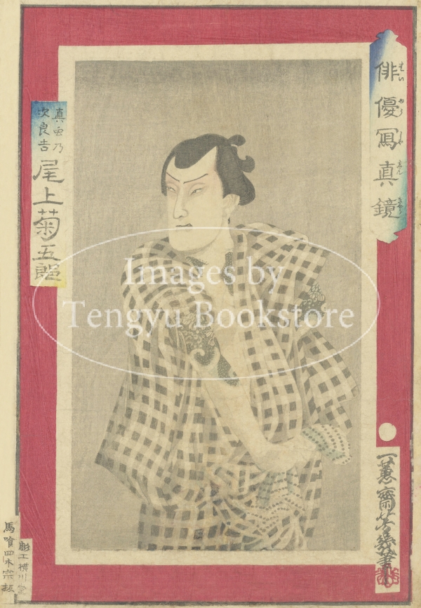 江戸後期・明治の浮世絵師 落合芳幾(1833-1904) による役者絵シリーズ「俳優写真鏡」より、五代目尾上菊五郎を描いた一枚。