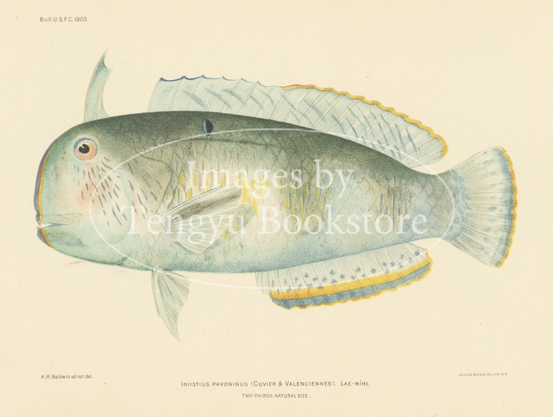 1907年ホノルルで刊行された「ハワイの魚類」の一図。ハワイに生息する色鮮やかな熱帯魚を、クロモリトグラフ(多色石版印刷)によって印刷した魚類小図鑑です。