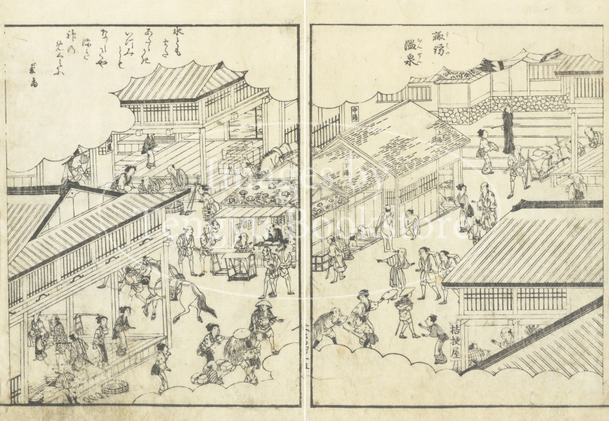 中山道とも呼ばれた木曽街道は、江戸から岐阜や長野を通って京都に至る街道のこと。本書は、当時数多くの名所図会を編纂した京都の文人 秋里籬島(あきさと りとう)によるもの。