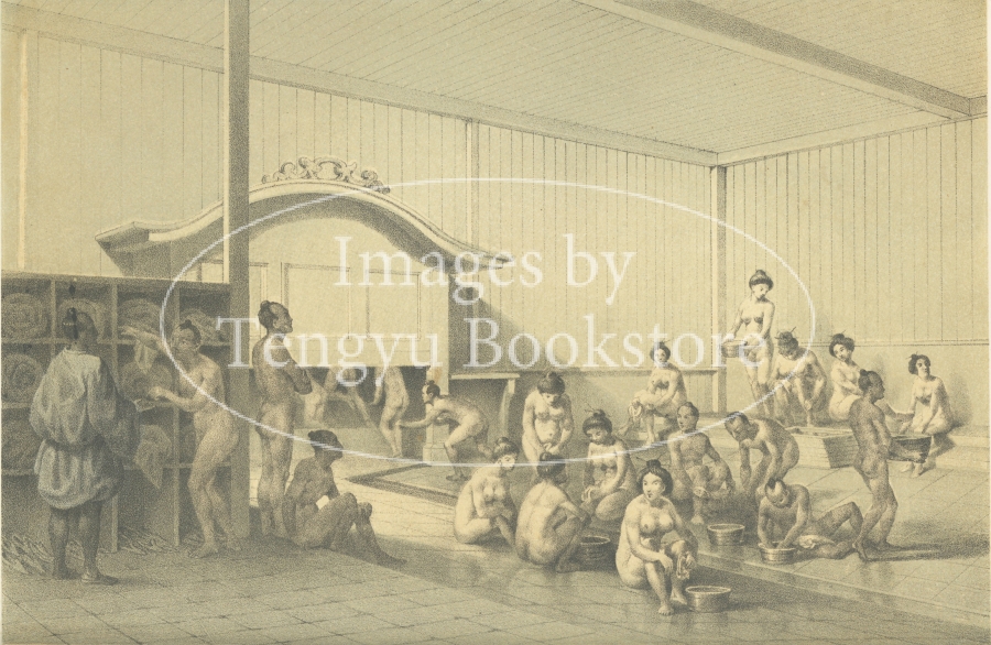 日本の銭湯を描いた本画像は、刊行当時、風紀上の好ましくない挿絵と見なされたため初版以降は削除された、希少な図版です。