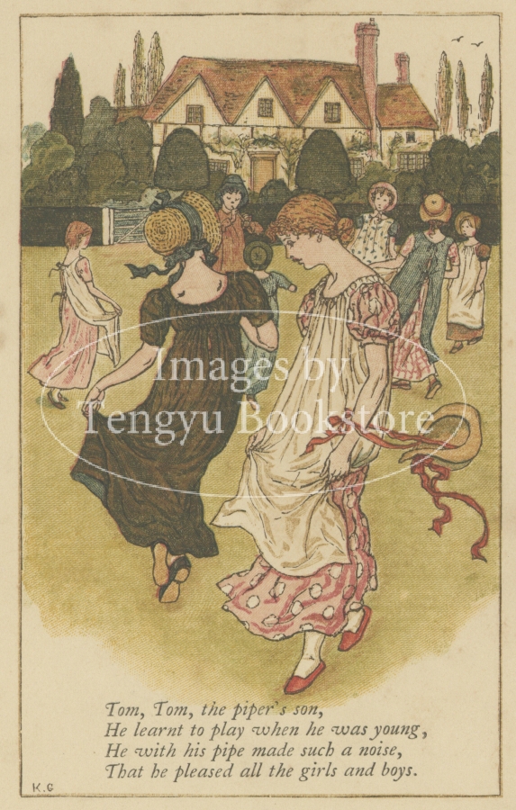 19世紀イギリスを代表する絵本作家ケイト・グリーナウェイ(1846-1901)がイギリスの伝承童謡マザー・グースにイラストをつけたケイト・グリーナウェイ版マザー・グースの1枚 "Tom,tom,the piper's son"。
