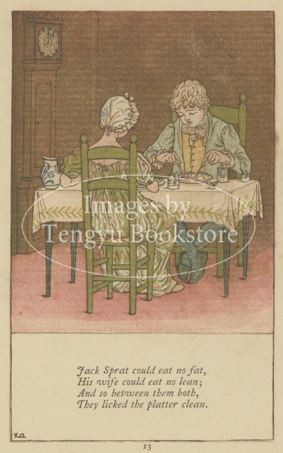 19世紀イギリスを代表する絵本作家ケイト・グリーナウェイ(1846-1901)がイギリスの伝承童謡マザー・グースにイラストをつけたケイト・グリーナウェイ版マザー・グースの1枚 "Jack Sprat"。