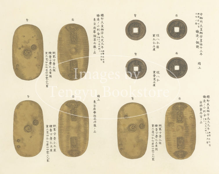 奈良時代の和同開珎にはじまり、江戸時代の大判小判、明治時代の金銀銅貨にいたる日本の貨幣の姿を精密な石版印刷で再現した美しい貨幣図鑑です。