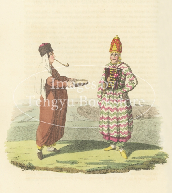 ラップランドやフィンランドから、中央アジア、シベリアまでの広大な地域に住む様々な民族の多彩な衣装を、美しい手彩色銅版画で記録した貴重な民族学資料です。