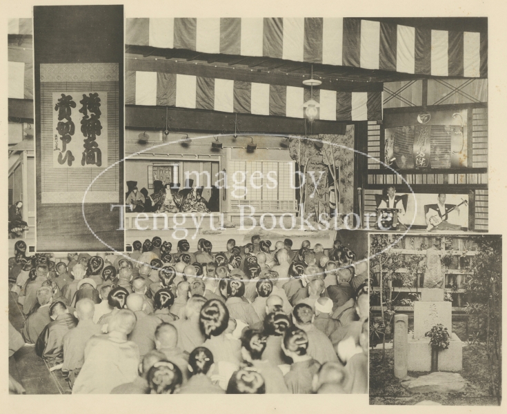 No 505 / 書名:大阪府写真帖 / Osaka Photo Album / 刊行国:Japan / 刊行年:1914 「大阪市御霊社境内にあり。浄瑠璃人形芝居の最も有名なるものなり。付図は浄瑠璃作者近松門左衛門の墨跡及ひ法妙寺にある其の墓なり。」