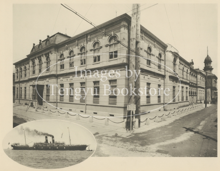 No 510 / 書名:大阪府写真帖 / Osaka Photo Album / 刊行国:Japan / 刊行年:1914 「明治十七年の創立に係り、東はアメリカより西はインドに至り、東洋の各港に亘りて四十余線の定期航路を経営せる大汽船会社なり。附図に示せるはこの会社所有の最大汽船亜米利加丸にして、総噸数六千三百噸なり。」