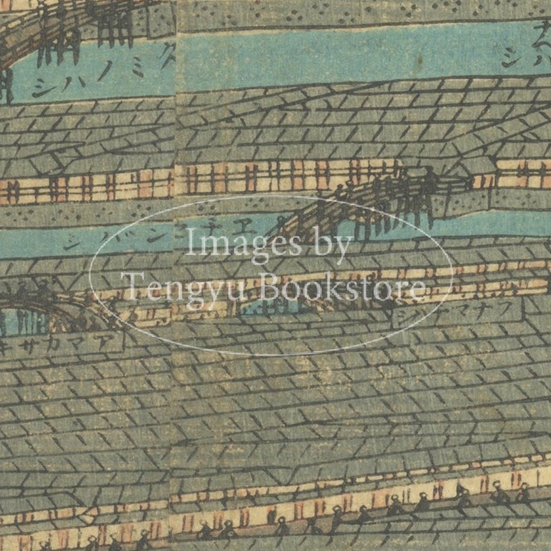 スケールの大きな風景画でありつつ、地図としても機能する細部の正確さで幕末の大阪を描いた本図は貞秀の代表作の一つです。