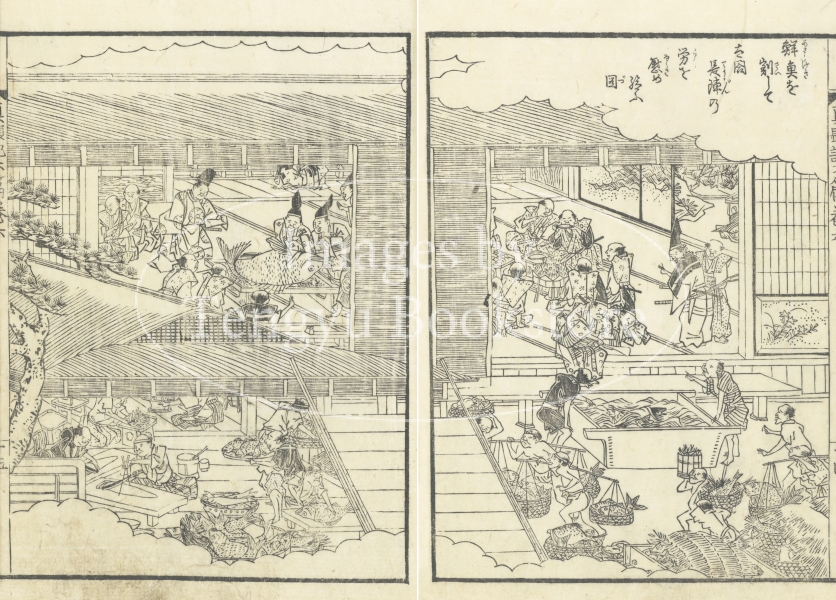 鮮魚を割して太閤長陣の労を慰め給ふ図