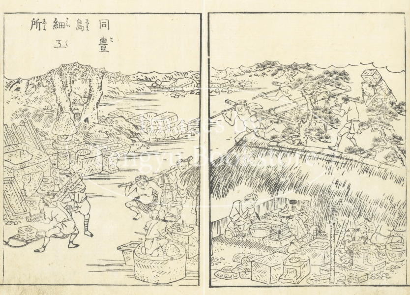 編著者は不明ながら、江戸中期の大阪を代表する知識人、木村兼葭堂が序文を書き、大阪の浮世絵師、蔀関月(しとみ かんげつ:1747-1797)が挿絵を手がけた本書は、伊丹の酒造にはじまり、砥石、蜂蜜、熊等の山の産物から、カツオ、ブリ、タイ、タコ等の海産物、長崎に持ち込まれた異国産物まで、当時の日本中の名産品を紹介した貴重な記録です。