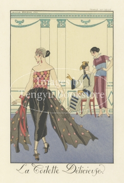 アールデコ時代を代表するファッション・イラストレーター、ジョルジュ・バルビエの洗練されたグラフィック・デザインと柔らかな色使いが光るファッションプレートの傑作です。