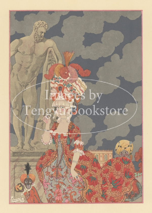 20世紀初頭フランスのイラストレーター、ジョルジュ・バルビエ(1882-1932)が、19世紀フランスの詩人ポール・ヴェルレーヌ(1844-1896)の代表作「艶なる宴」を描いた挿絵本中の一枚。
