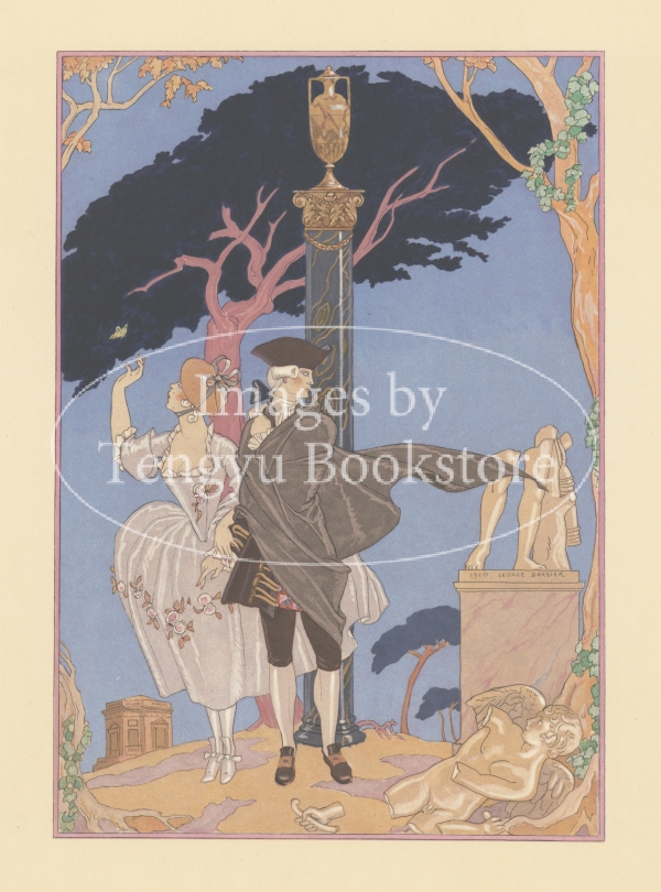 20世紀初頭フランスのイラストレーター、ジョルジュ・バルビエ(1882-1932)が、19世紀フランスの詩人ポール・ヴェルレーヌ(1844-1896)の代表作「艶なる宴」を描いた挿絵本中の一枚。