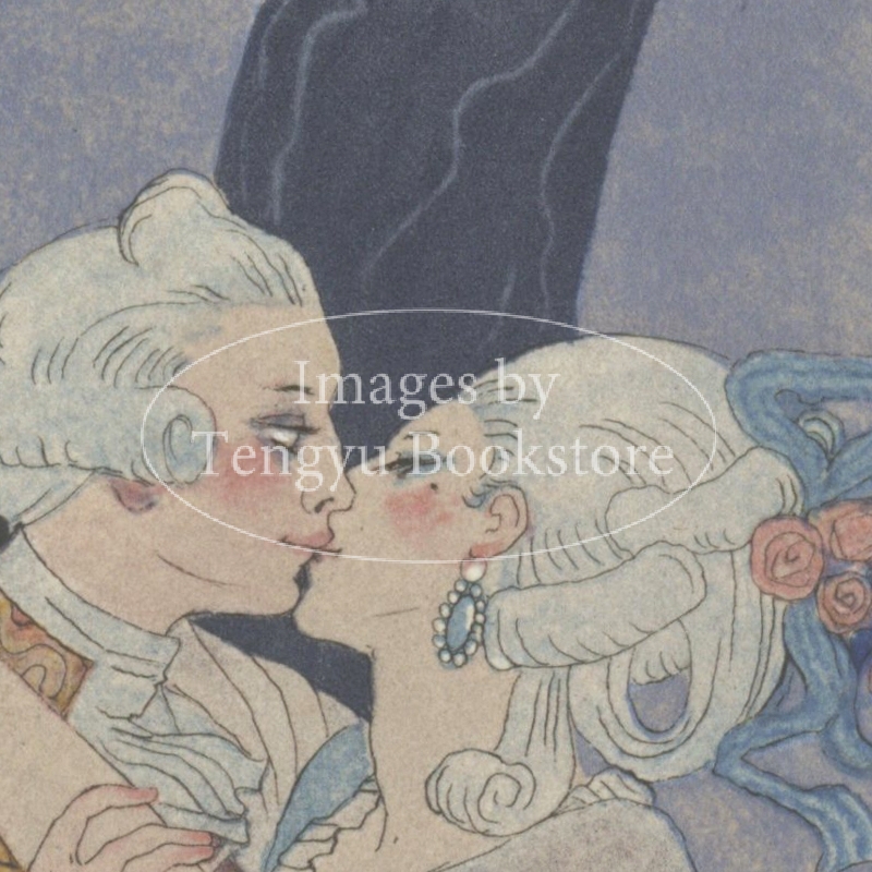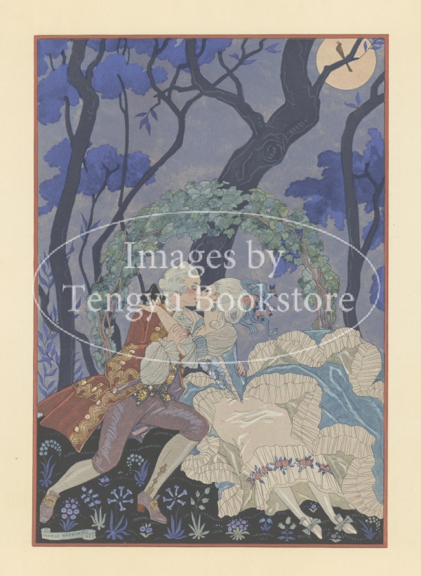 20世紀初頭フランスのイラストレーター、ジョルジュ・バルビエ(1882-1932)が、19世紀フランスの詩人ポール・ヴェルレーヌ(1844-1896)の代表作「艶なる宴」を描いた挿絵本中の一枚。