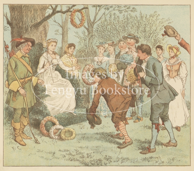 19世紀イギリスを代表する絵本作家の一人、ランドルフ・コルデコット(1846-1886)の絵本「おいで、若い娘と息子たち」のイラスト。