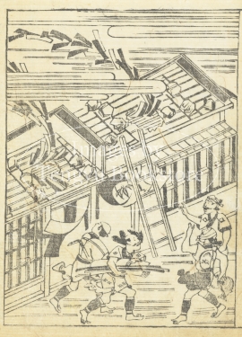 鎌倉時代の随筆「方丈記」の江戸初期刊行版の挿絵。