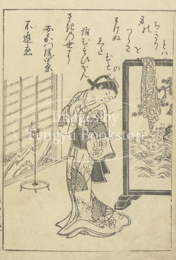 江戸前期から中期にかけて活躍した京都の絵師 西川祐信(にしかわ すけのぶ:1671-1750)による絵本の挿絵。