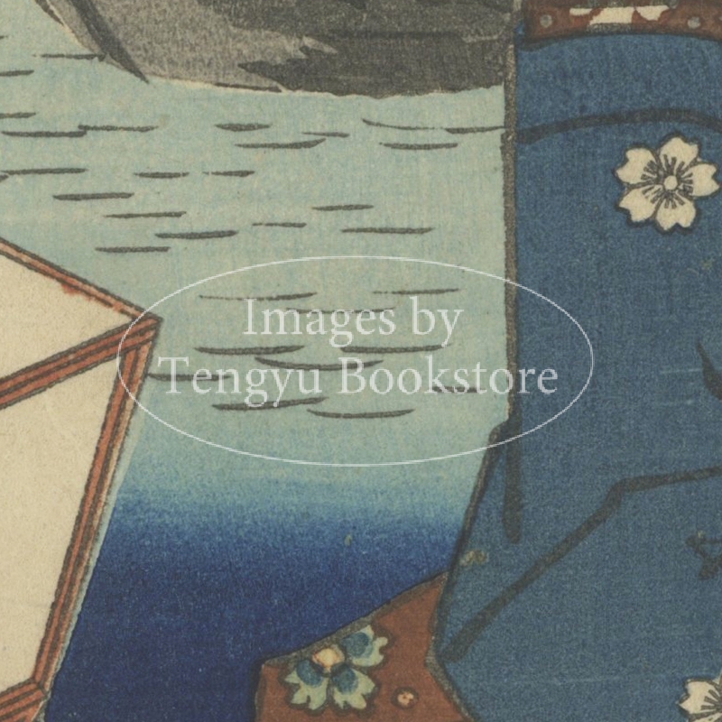 歌川国貞(豊国三代目:1786-1865)が人物を描き、二代目歌川広重(1826-1869)が風景を手がけた合作浮世絵です。