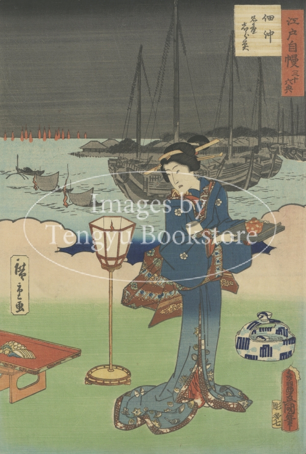 江戸の名所と名物に、美人画を組み合わせたシリーズの1枚。
