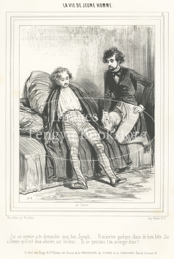 19世紀フランスの挿絵画家ガヴァルニ(ギヨーム=シュルピス・シュヴァリエ/1804-1866)による風刺イラストシリーズのひとつ「青年の生活」中の1枚。