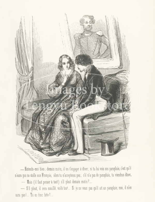 19世紀フランスの挿絵画家ガヴァルニ(ギヨーム=シュルピス・シュヴァリエ/1804-1866)の作品集「ガヴァルニ:作品選集―現代風俗の研究」に収録されたシリーズ「Fourberies de Femmes / 女たちのたくらみ」中の一図。
