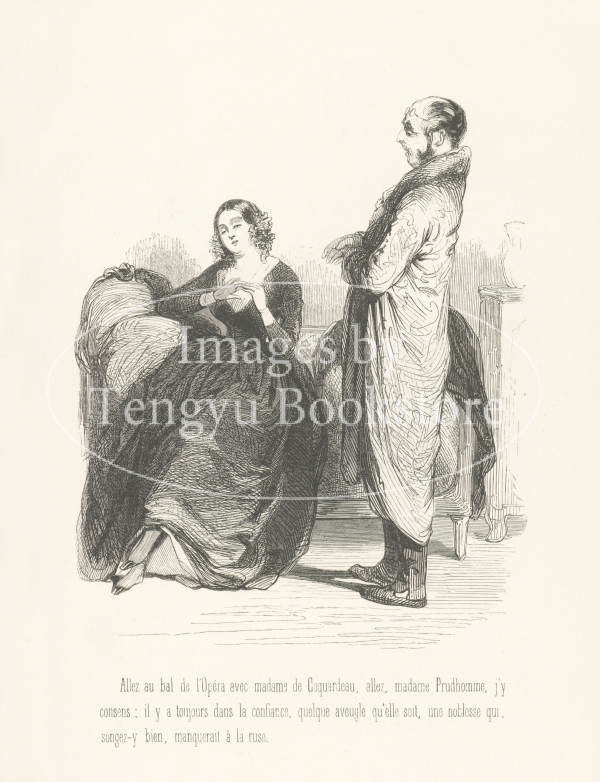 19世紀フランスの挿絵画家ガヴァルニ(ギヨーム=シュルピス・シュヴァリエ/1804-1866)の作品集「ガヴァルニ:作品選集―現代風俗の研究」に収録されたシリーズ「Fourberies de Femmes / 女たちのたくらみ」中の一図。