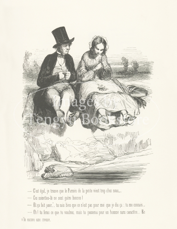 19世紀フランスの挿絵画家ガヴァルニ(ギヨーム=シュルピス・シュヴァリエ/1804-1866)の作品集「ガヴァルニ:作品選集―現代風俗の研究」に収録されたシリーズ「Fourberies de Femmes / 女たちのたくらみ」中の一図。