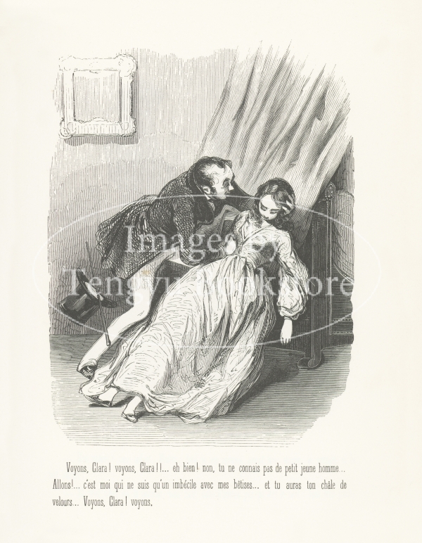 19世紀フランスの挿絵画家ガヴァルニ(ギヨーム=シュルピス・シュヴァリエ/1804-1866)の作品集「ガヴァルニ:作品選集―現代風俗の研究」に収録されたシリーズ「Fourberies de Femmes / 女たちのたくらみ」中の一図。