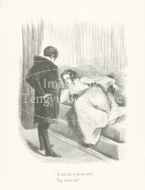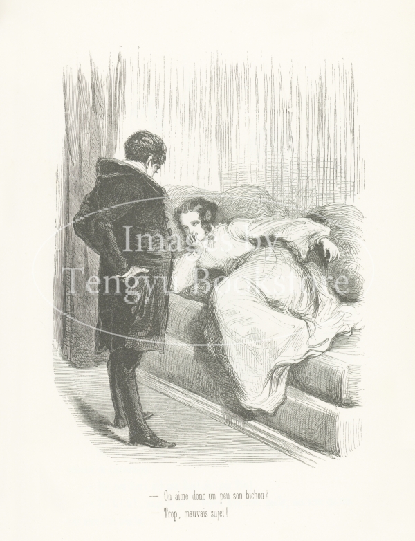 19世紀フランスの挿絵画家ガヴァルニ(ギヨーム=シュルピス・シュヴァリエ/1804-1866)の作品集「ガヴァルニ:作品選集―現代風俗の研究」に収録されたシリーズ「Fourberies de Femmes / 女たちのたくらみ」中の一図。