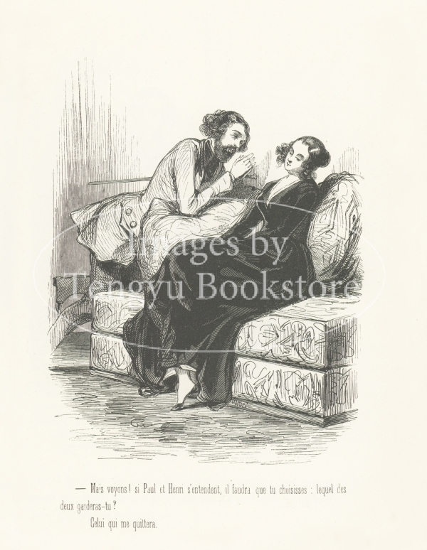19世紀フランスの挿絵画家ガヴァルニ(ギヨーム=シュルピス・シュヴァリエ/1804-1866)の作品集「ガヴァルニ:作品選集―現代風俗の研究」に収録されたシリーズ「Fourberies de Femmes / 女たちのたくらみ」中の一図。