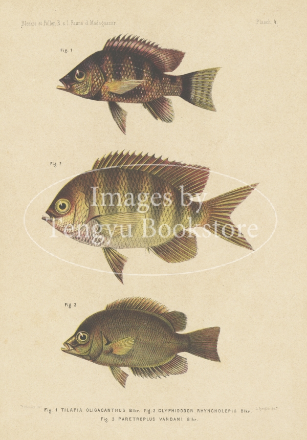 19世紀オランダの博物学書「マダガスカル動物相研究」に収録された魚類図のひとつ。