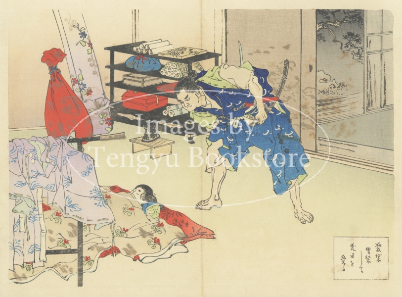 明治期に活躍した浮世絵師 安達吟光(あだちぎんこう/?-1902)による日本の故事を題材にした木版画集「美術歴史図会」収録の1枚。